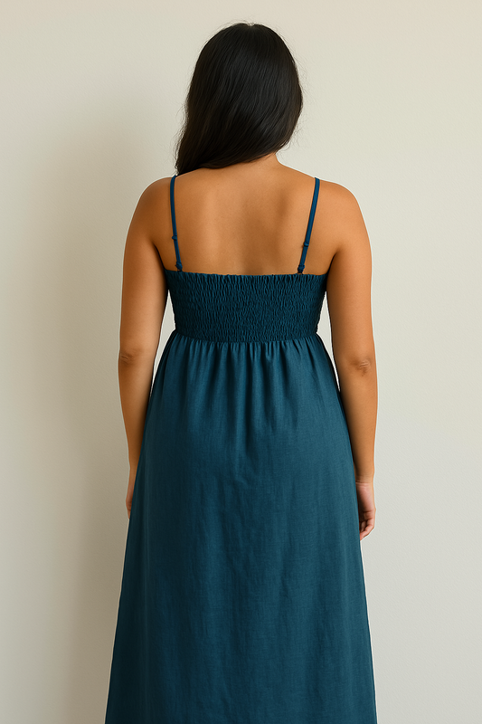 SMOCKED LINEN BLEND DRESS WITH THIN STRAPS - TEAL
