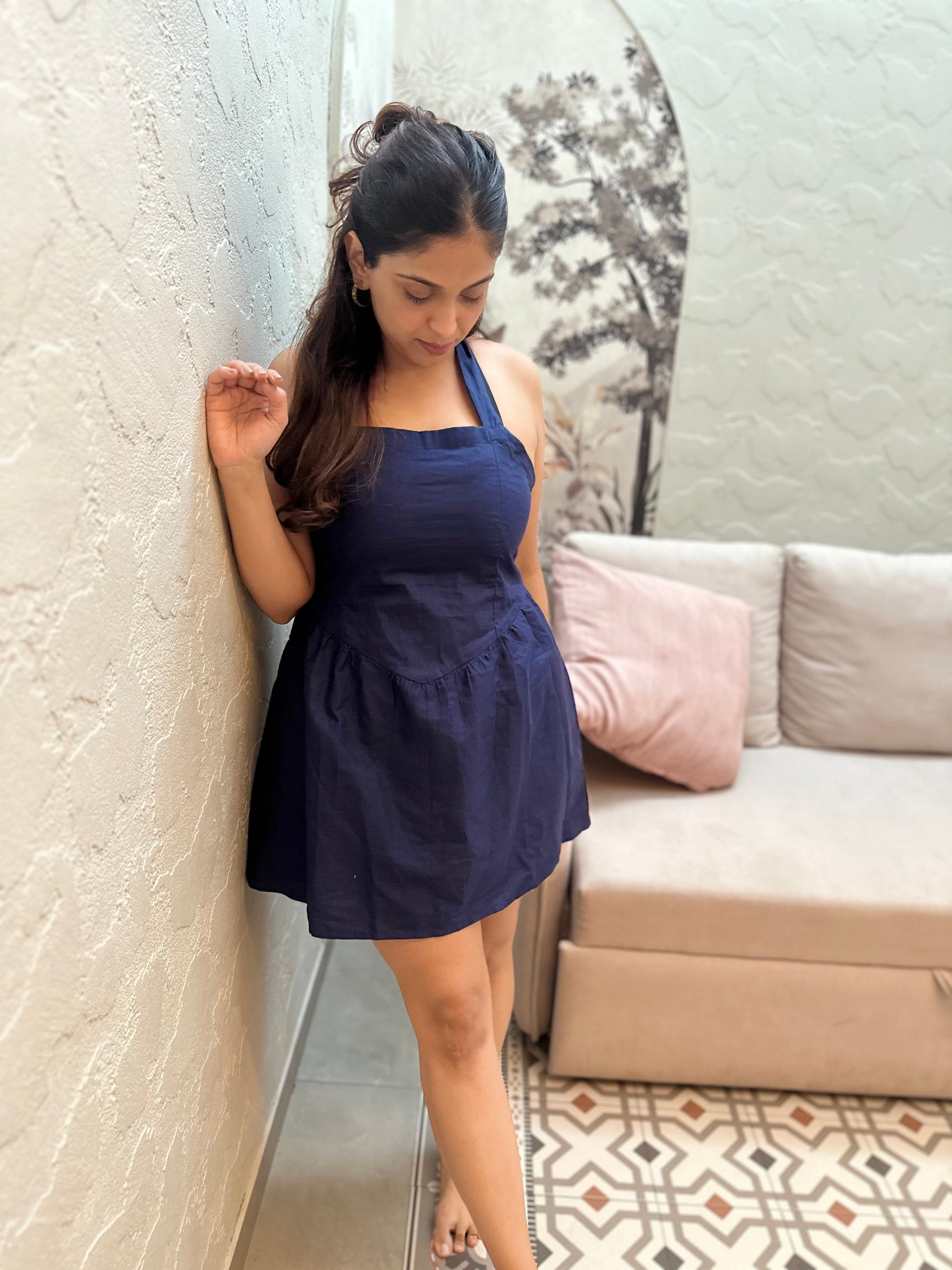 100% cotton halter neck maxi dress with gathering at the waist, tie up and zip closure at the back. Opaque. Unlined