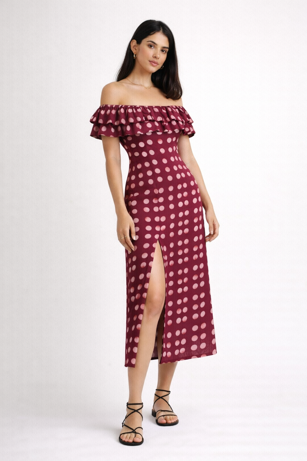 100% Cotton polka dots print off the shoulder dress with slit on the left leg and frill detail around the bust. Unlined.