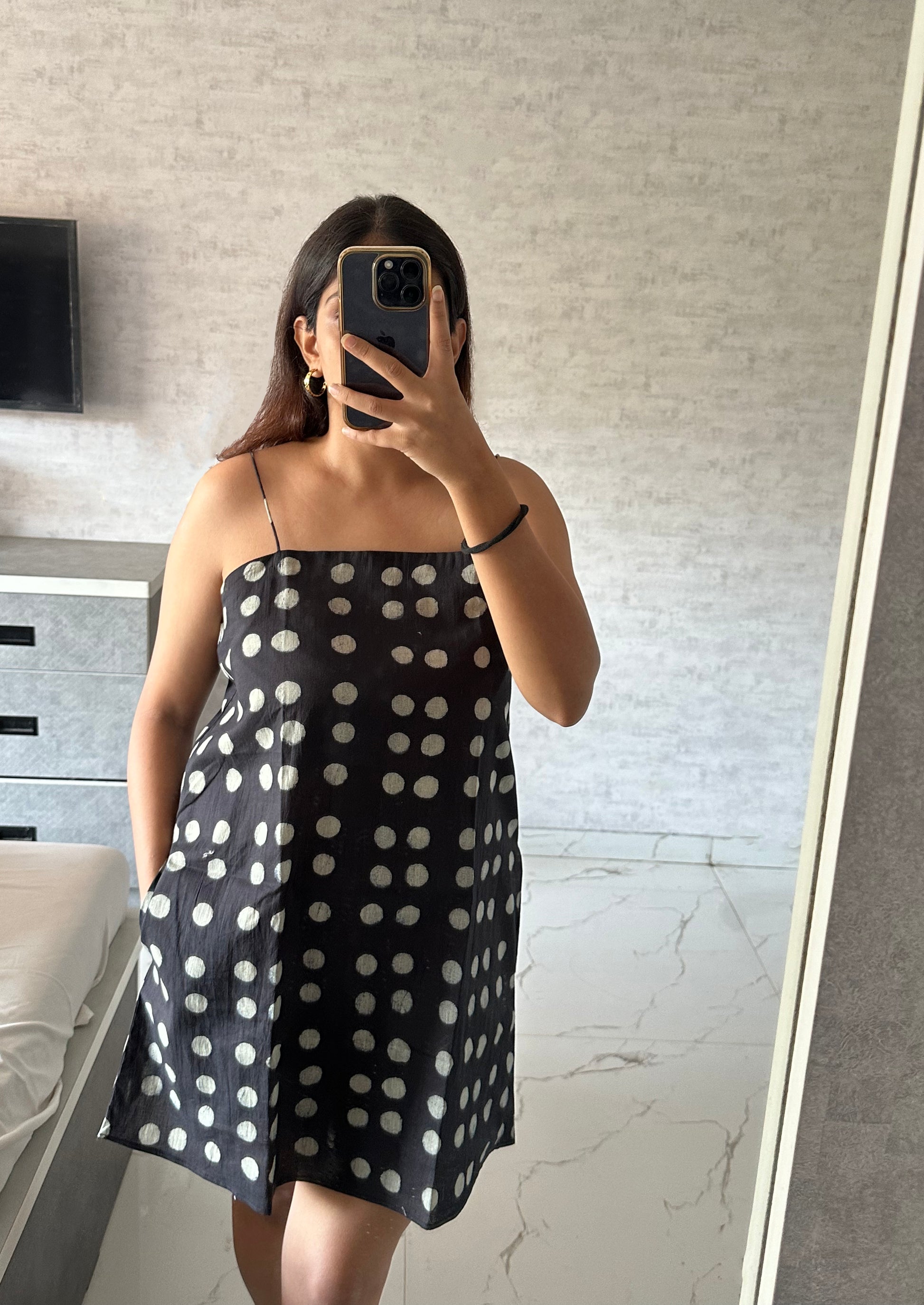 100% cotton polka dress with square neckline and thin straps. Lined.