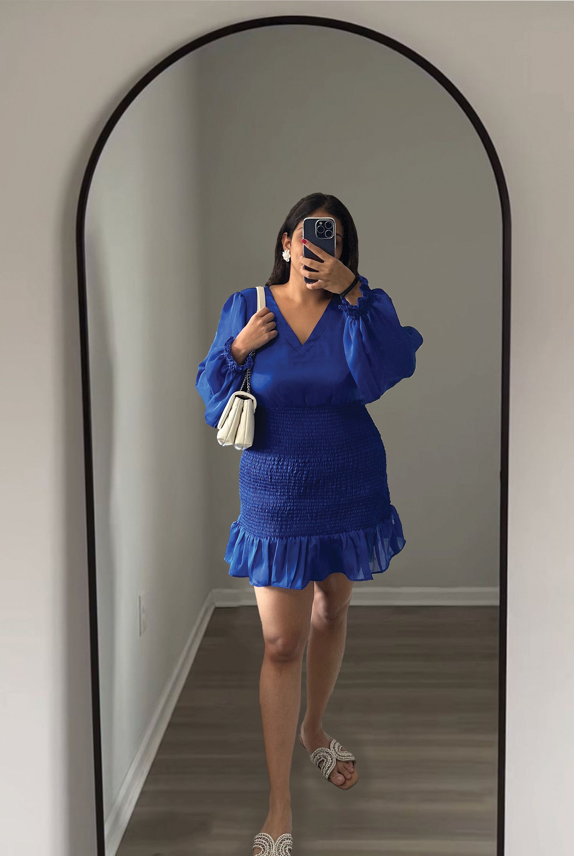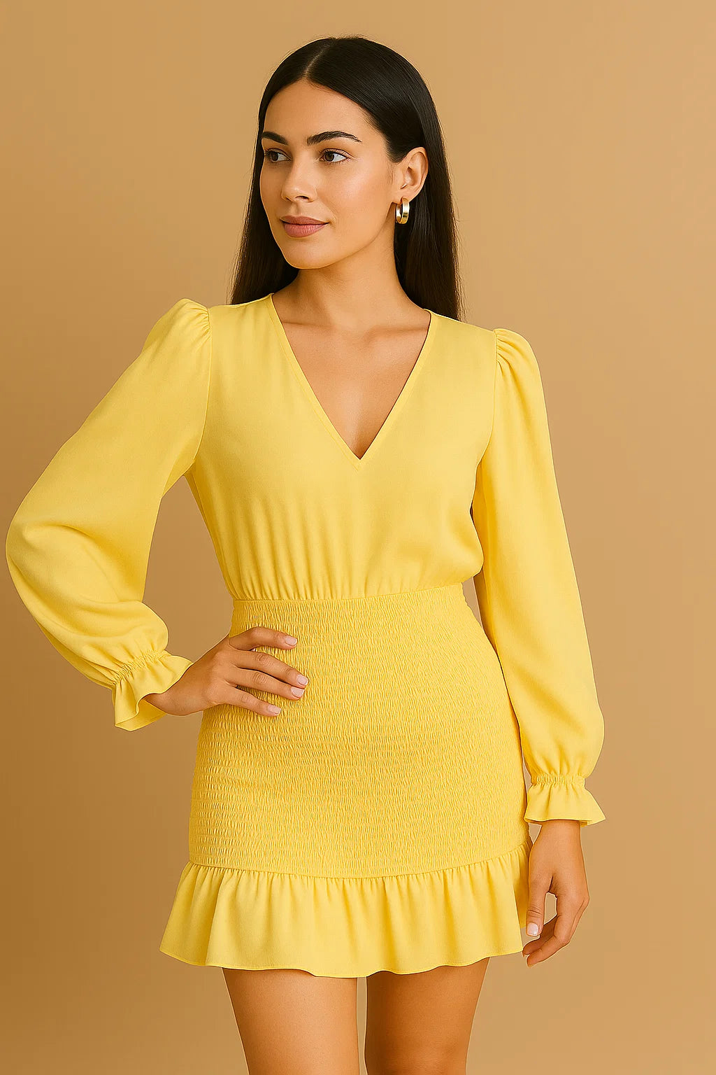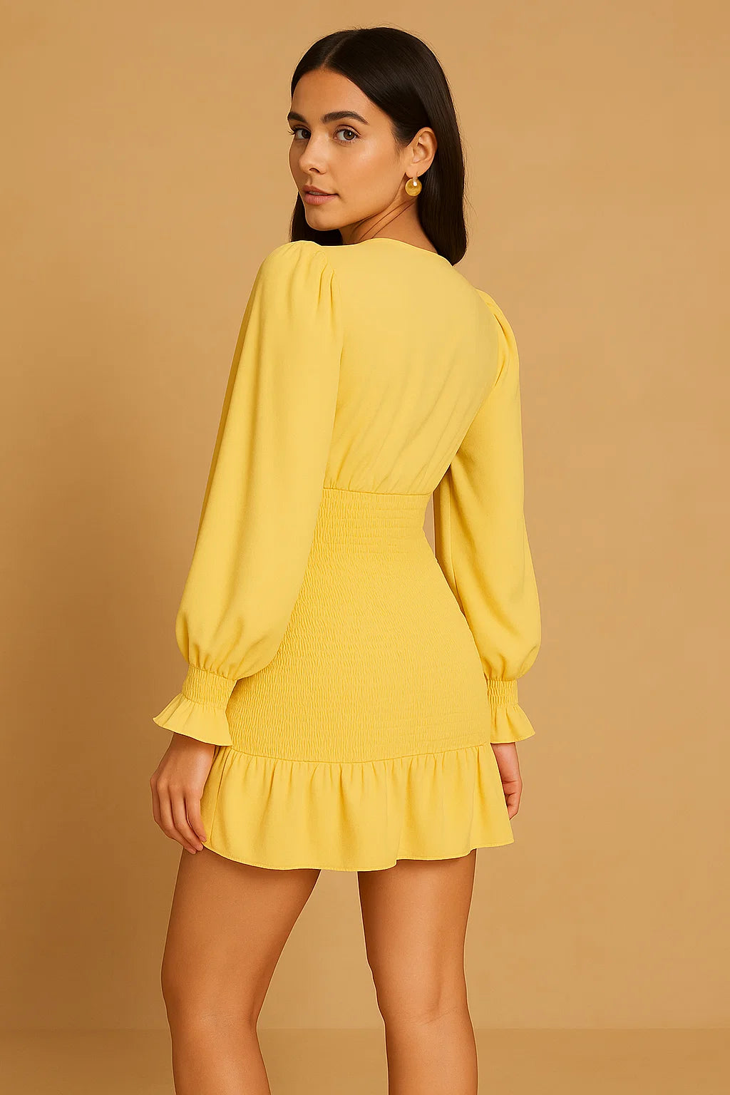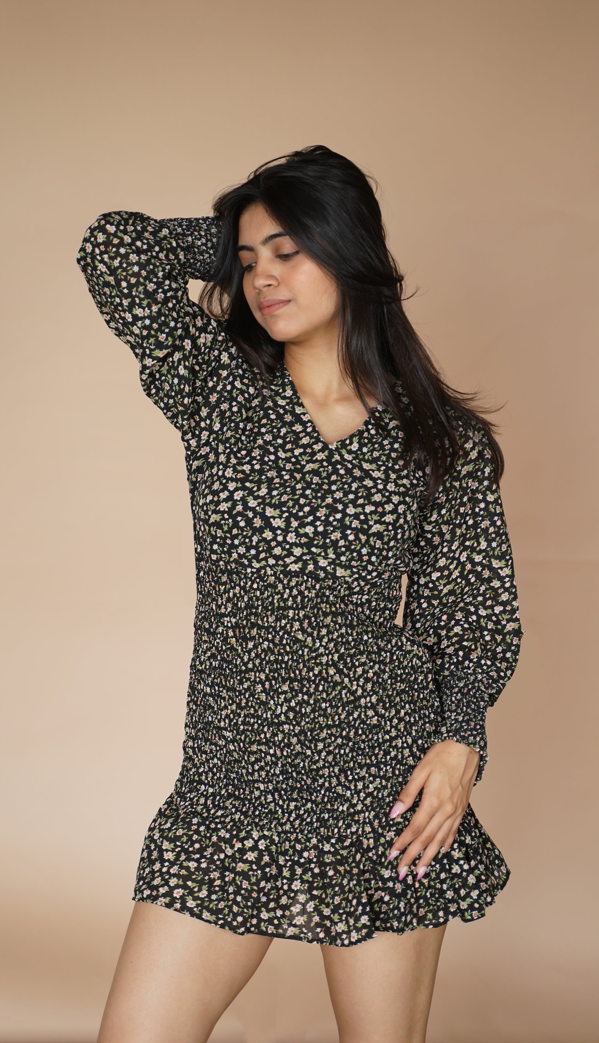 Short smocked dress with v-neckline. Full sleeves with smocked hem. Smocked detailing from waist and frill detailing on the hem of the dress. Lined.