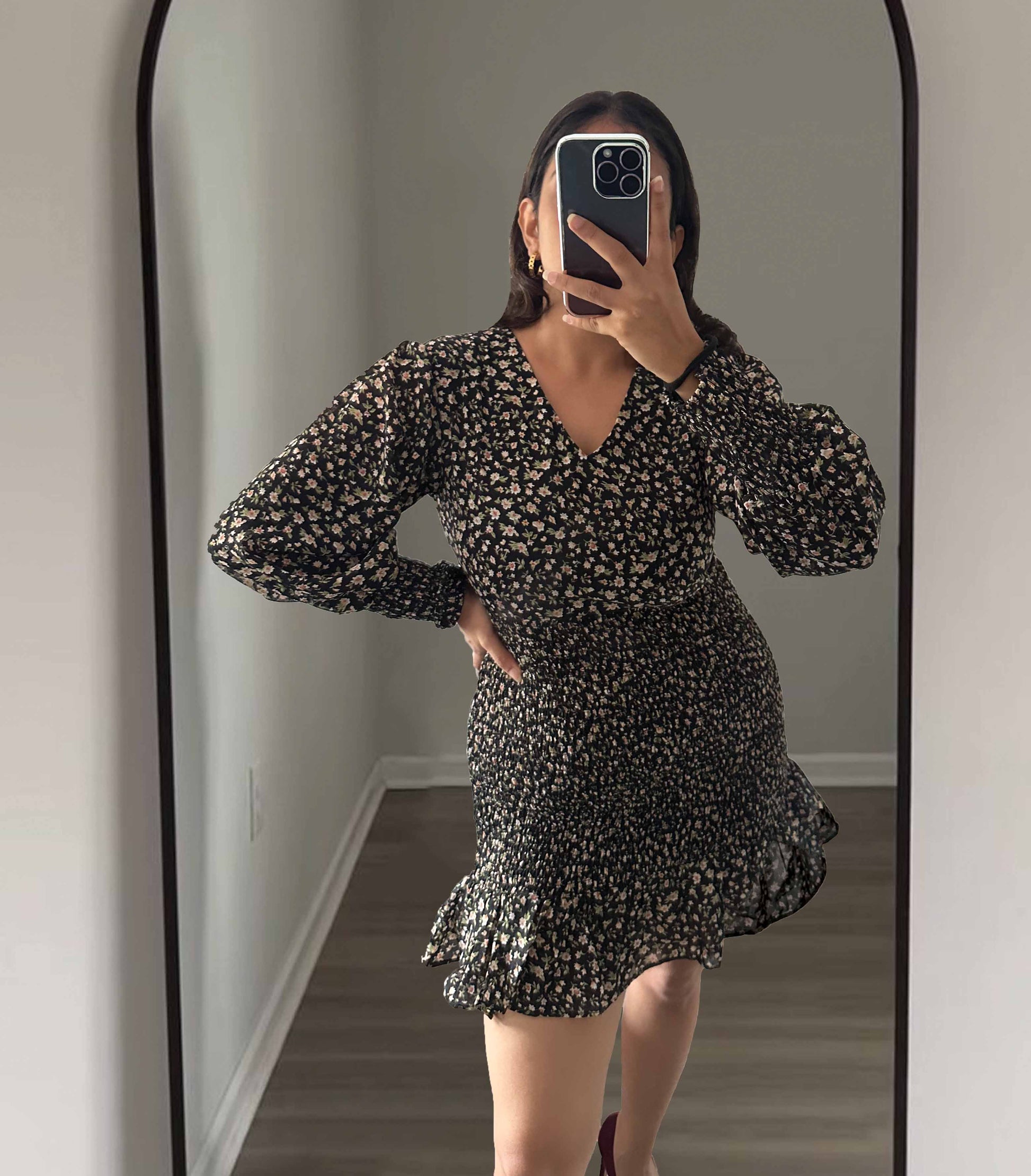 Style: Smocked, Printed, Fill Sleeves, Dark Floral Dress