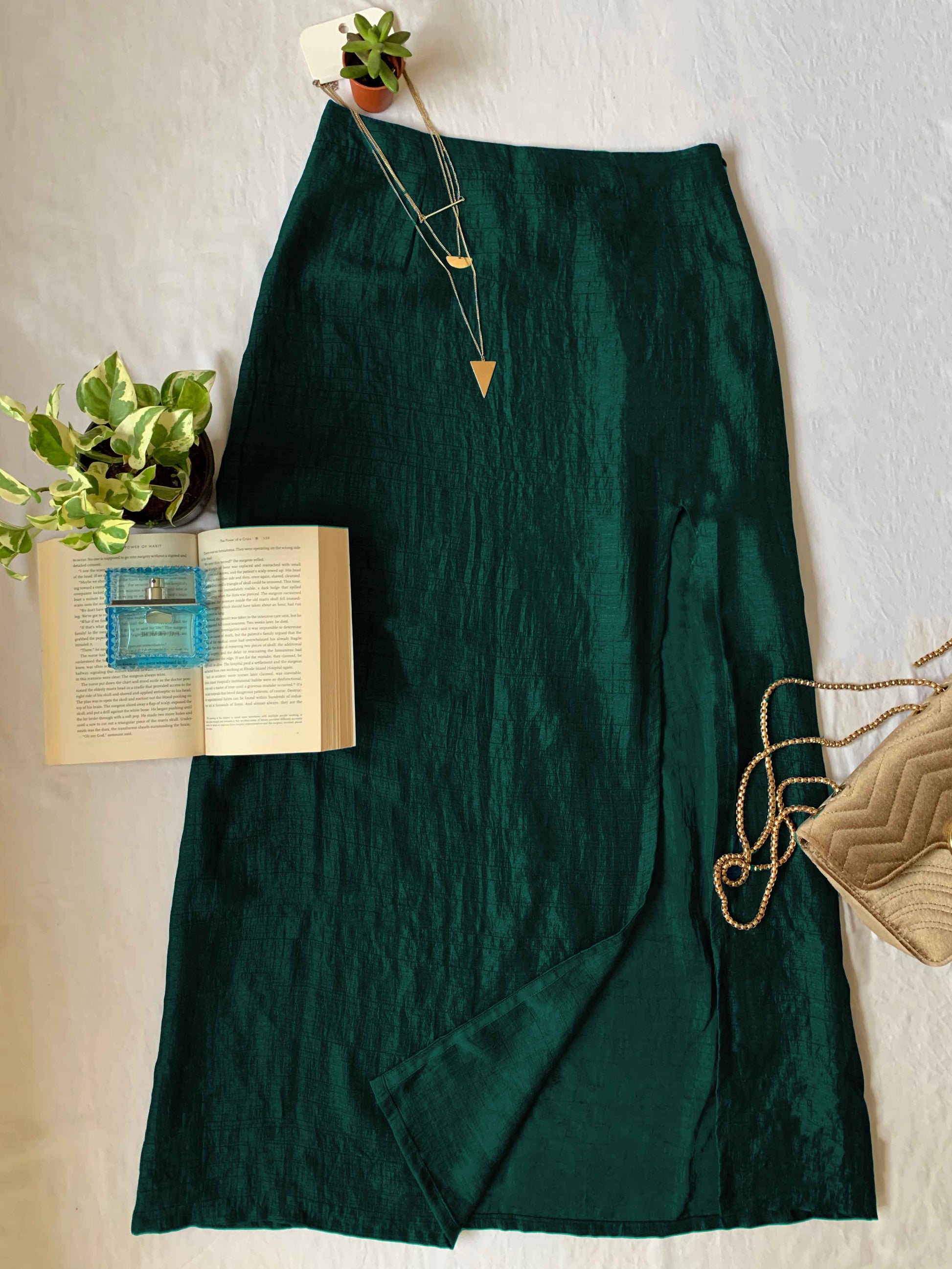 FRONT SLIT TEXTURED SKIRT - DARK GREEN