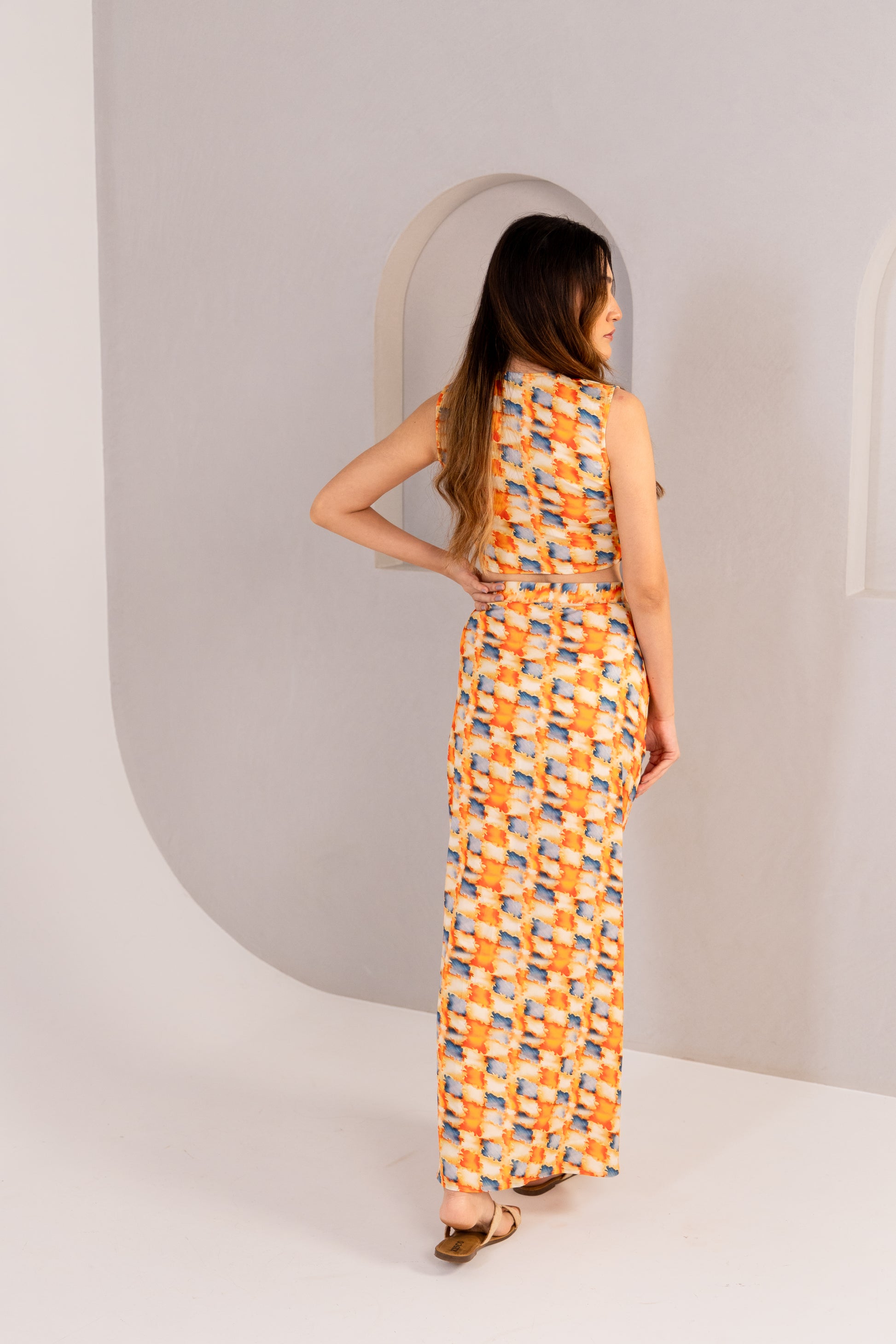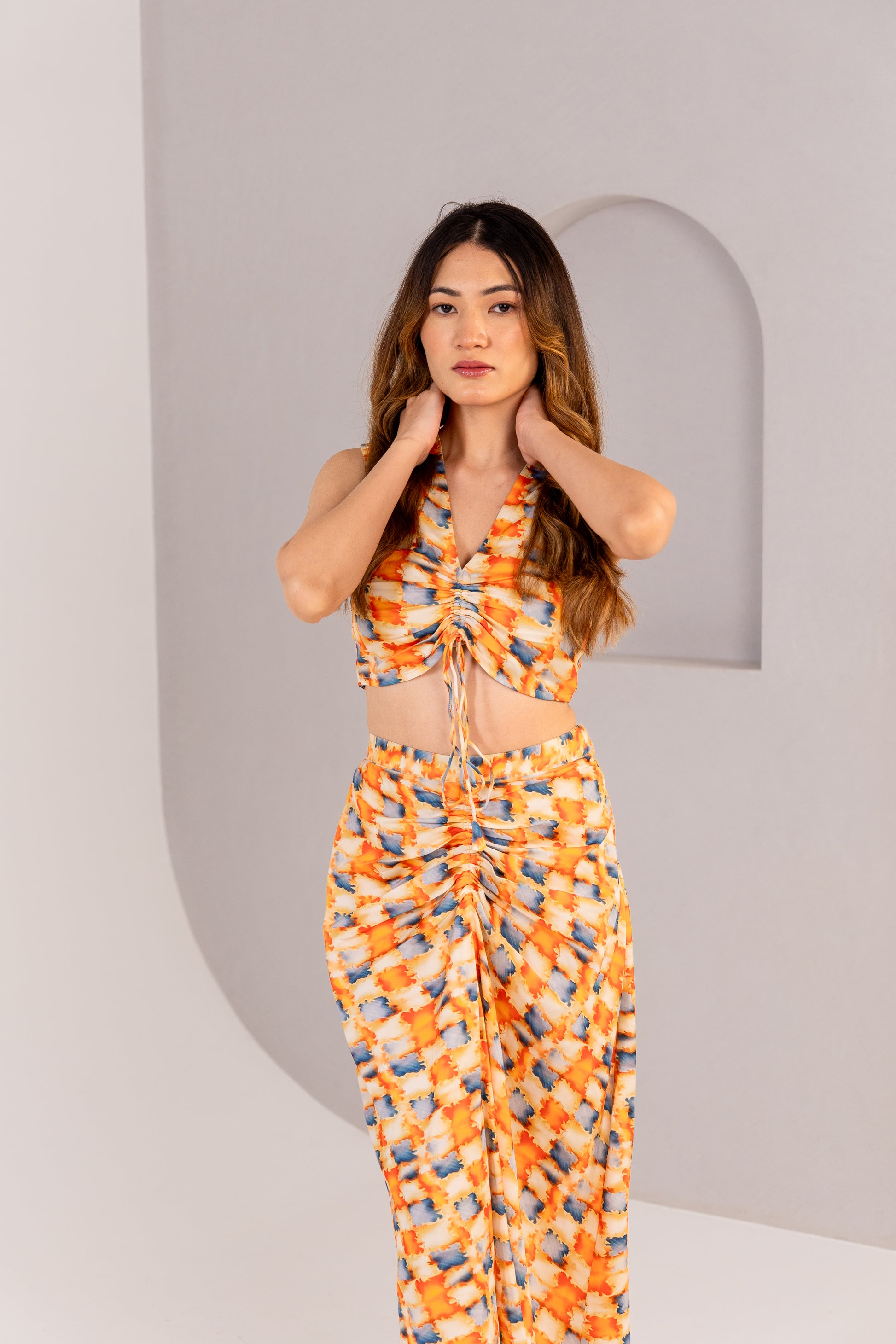 Printed coordinated set with drawstring gathering on the blouse and at the skirt’s front. Unlined.
